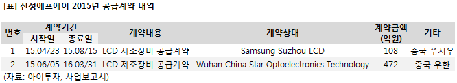 금융감독원 전자공시에 따르면 신성에프에이는 중국 Wuhan China Star Optoelectronics Technology와 472억원(2014년 매출액의 34.9%) 규모의 LCD 제조장비 공급계약을 맺었다고 전일 공시했다. 계약기간은 지난 5일부터 내년 3월 31일까지고, 중국 우한으로 공급된다. 이로써 올해 신성에프에이는 2차례에 걸쳐 총 579억원(2014년 매출액의 42.8%) 장비공급계약을 체결했다.