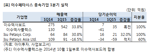 이와 함께 종속회사의 실적도 개선되고 있다. 이수페타시스의 종속회사 이수엑사보드는 또 다른 이수엑사플렉스를 지난해 10월 흡수합병 했다. 당시 ‘경영효율성 증대를 통한 기업가치 제고’를 위해 합병한다고 목적을 밝혔다. 합병 이후 지난 1분기 실적은 대폭 개선됐다. 매출액은 542억원으로 전년 동기 대비 33.8%, 당기순이익은 35억원으로 흑자전환에 성공했다.