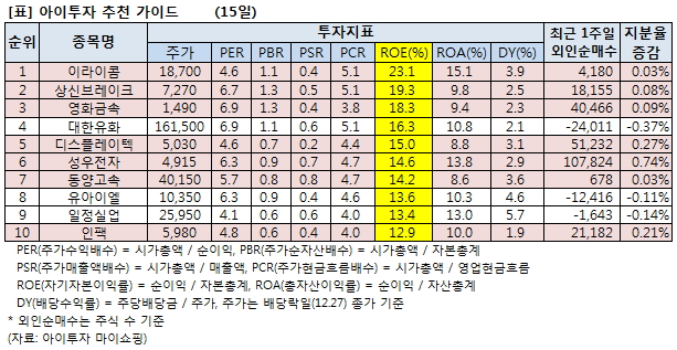 아래 리스트는 아이투자 추천 가이드 요건을 만족하는 종목을 골라낸 후 이를 ROE가 높은 순으로 정렬한 것이다.