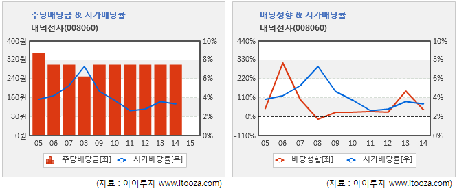 이런 가운데 주가 약세로 배당 매력은 커졌다. 대덕전자는 지난 10년간 꾸준히 배당을 실시했으며, 주당 배당금은 최저 250원, 최고 350원이다. 2009년부터 주당 배당금은 300원을 유지했다. 올해도 지난해와 같은 배당금을 지급한다고 가정할 경우, 전일 종가 기준 기대되는 시가배당률은 3.8%다.