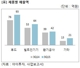 ▷ 제품: 주방 배기용 렌지 후드 (45.5%) 중저가형 후드 (11년 대당 4만2547원 → 12년 4만1243원 → 13년 4만3042원 → 14년 4만2481원 → 15년 반기 4만5675원) 고가형 후드 (11년 대당 23만1776원 → 12년 22만8669원 → 13년 20만9670원 → 14년 21만5027원 → 15년 반기 21만7980원) ▷ 상품: 가스·전기 쿡탑, 음식물탈수기, 행주도마살균기, 수입후드 등 (27.7%) ▷ 공사: 주택환기시스템 (18.3%) * 괄호 안은 매출 비중 및 가격 추이 |