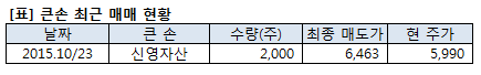 신영자산은 진도 지분을 축소했다고 지난 11월 2일 공시했다. 보고서 작성기준일인 지난 10월 30일 보유량은 일임계약 보유분 4.06%(50만5651주)가 포함된 10.90%로 직전보고서(2015년 9월 21일) 대비 1.21%P(15만267주) 감소했다. 최근 거래일인 지난 10월 23일에는 2000주를 주당 6463원에 장내매도했다.