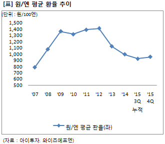 이런 가운데 최근 원/엔 환율이 반등세를 나타내고 있어 향후 추이에 대한 면밀한 관찰이 필요하게 됐다. 금융정보 제공업체인 와이즈에프엔에 따르면 올 1월 누적 기준(1.4~1.27) 원/엔 환율은 1017원을 기록했다. 전분기와 지난해 1분기 평균에 비해 각각 7%와 10.2% 상승했다.