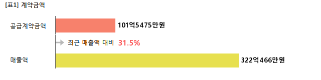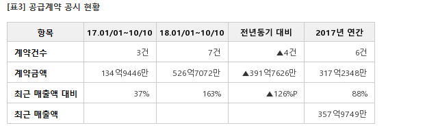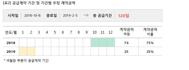 계약기간은 2018년 10월 8일부터 2019년 2월 5일까지 총 공급기간은 120일이다. 이번에 체결한 공급계약 금액은 최근 매출액 322억466만원 대비 31.5% 규모다.