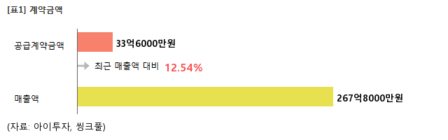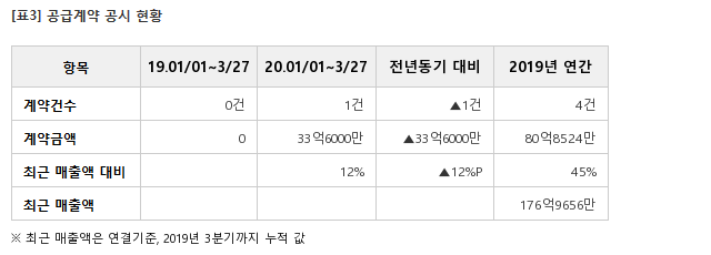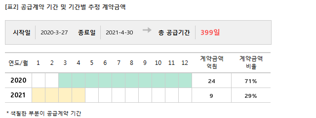 계약기간은 2020년 3월 27일부터 2021년 4월 30일까지 총 공급기간은 399일이다. 이번에 체결한 공급계약 금액은 최근 매출액 267억8000만원 대비 12.54% 규모다.