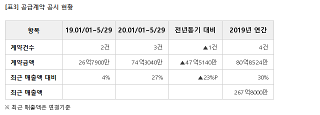 계약기간은 2020년 5월 29일부터 2021년 6월 30일까지 총 공급기간은 397일이다. 이번에 체결한 공급계약 금액은 최근 매출액 267억8000만원 대비 9.32% 규모다.
